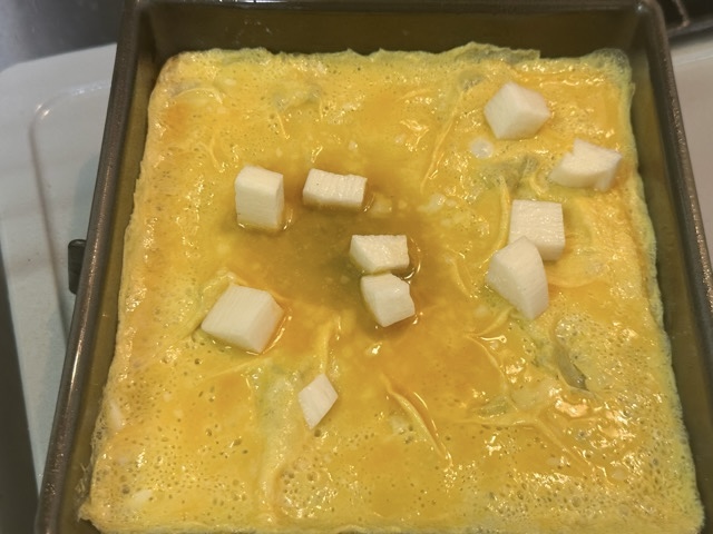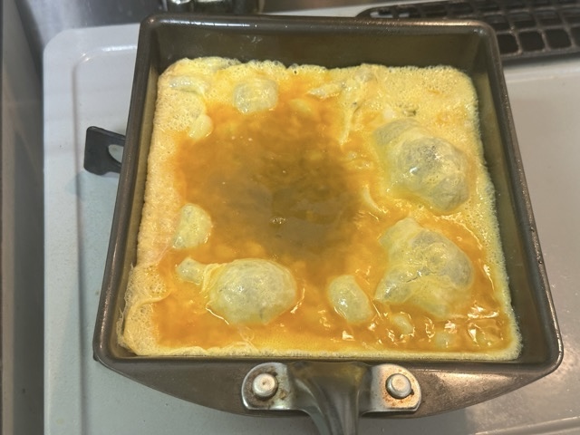 - 玉子焼き器に油を敷き熱し、2の1/3量を流し入れます。