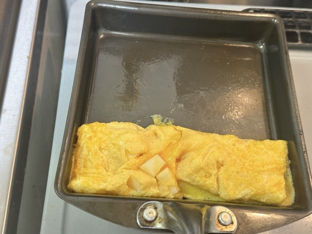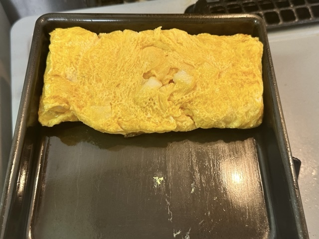 出汁巻き卵は、よく巻くのが難しいとされていますので、ここでは少し固めに作りました(^^♪