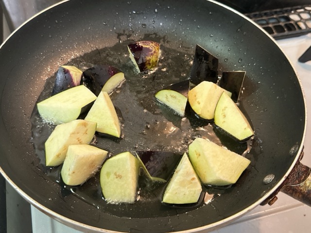 - 熱したフライパンに油を敷き、2の茄子を炒めます。