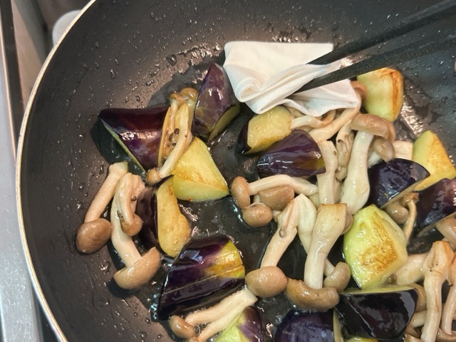 - 茄子が柔らかくなってきたら、余計な油を拭き取ります。
