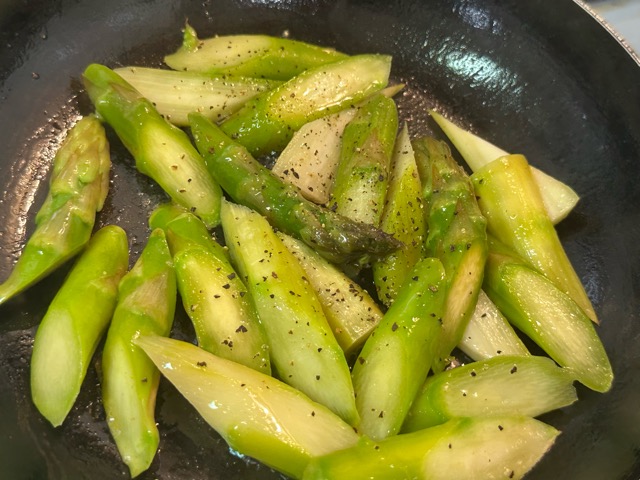 - 熱したフライパンにバターを入れ溶かし、3のアスパラを炒めます。