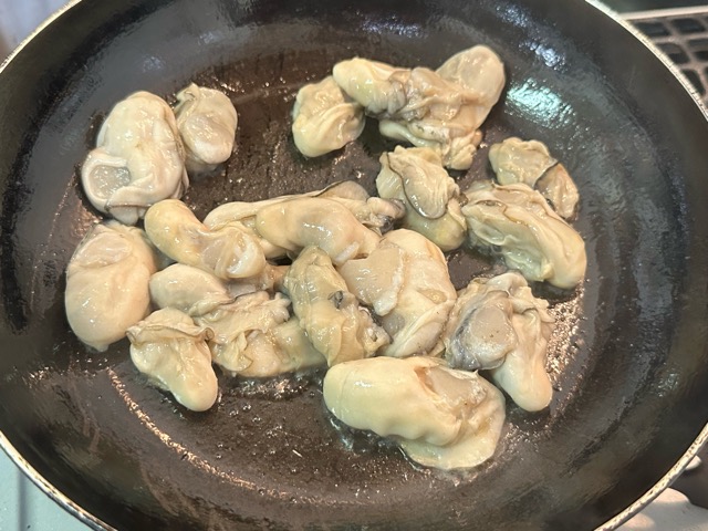 - フライパンにごま油を流し入れ強火にかけ、2の牡蛎を炒めます。