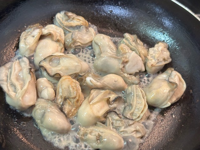 - 4の牡蛎の実がふっくらしてきたら、オイスターソースを流し入れ中火にします。