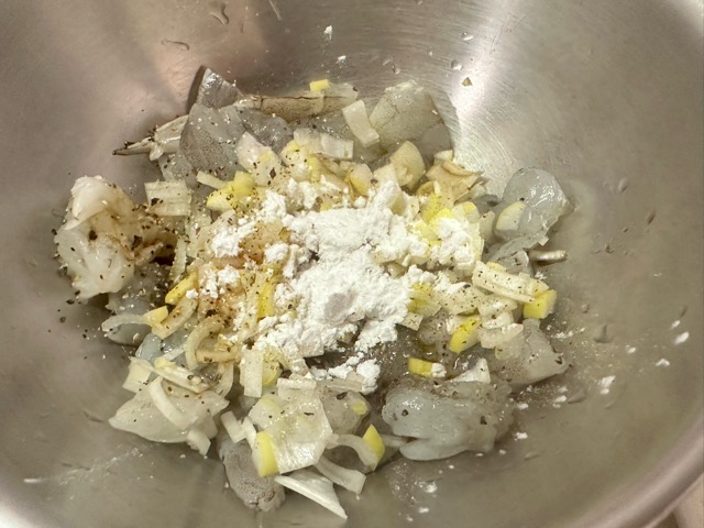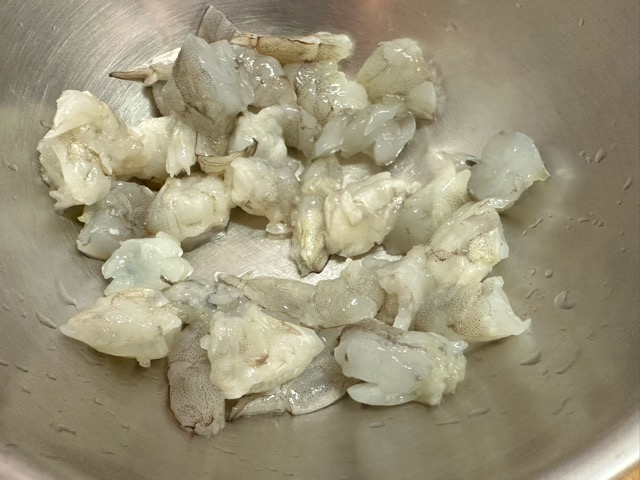 - 海老の背ワタを取り除き5㎝位にカットし、流水で良く洗います。