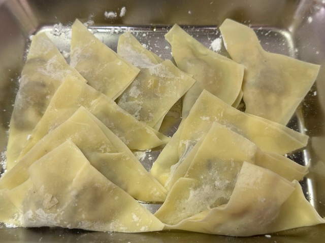 - 3を15g取り、ワンタンの皮で綺麗に包みます。